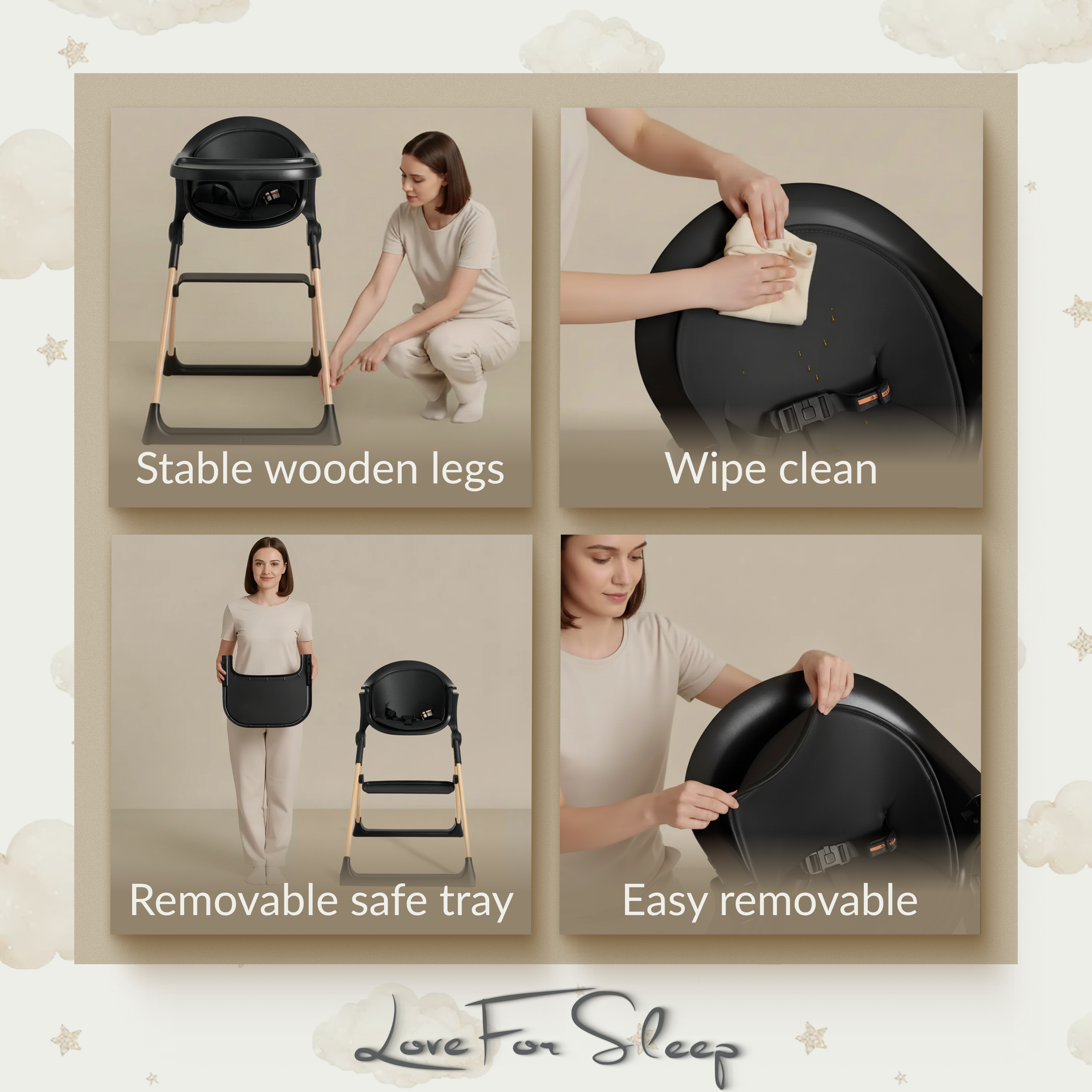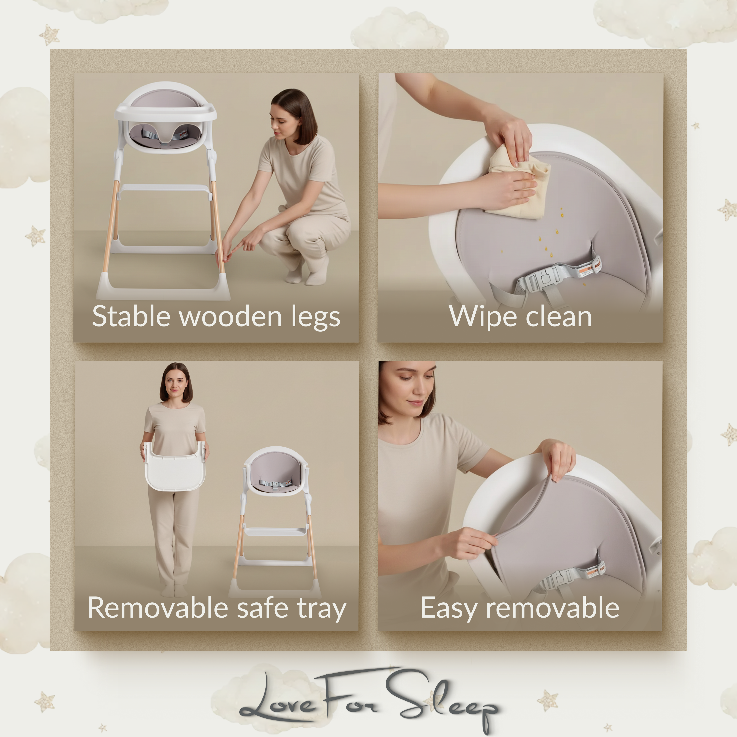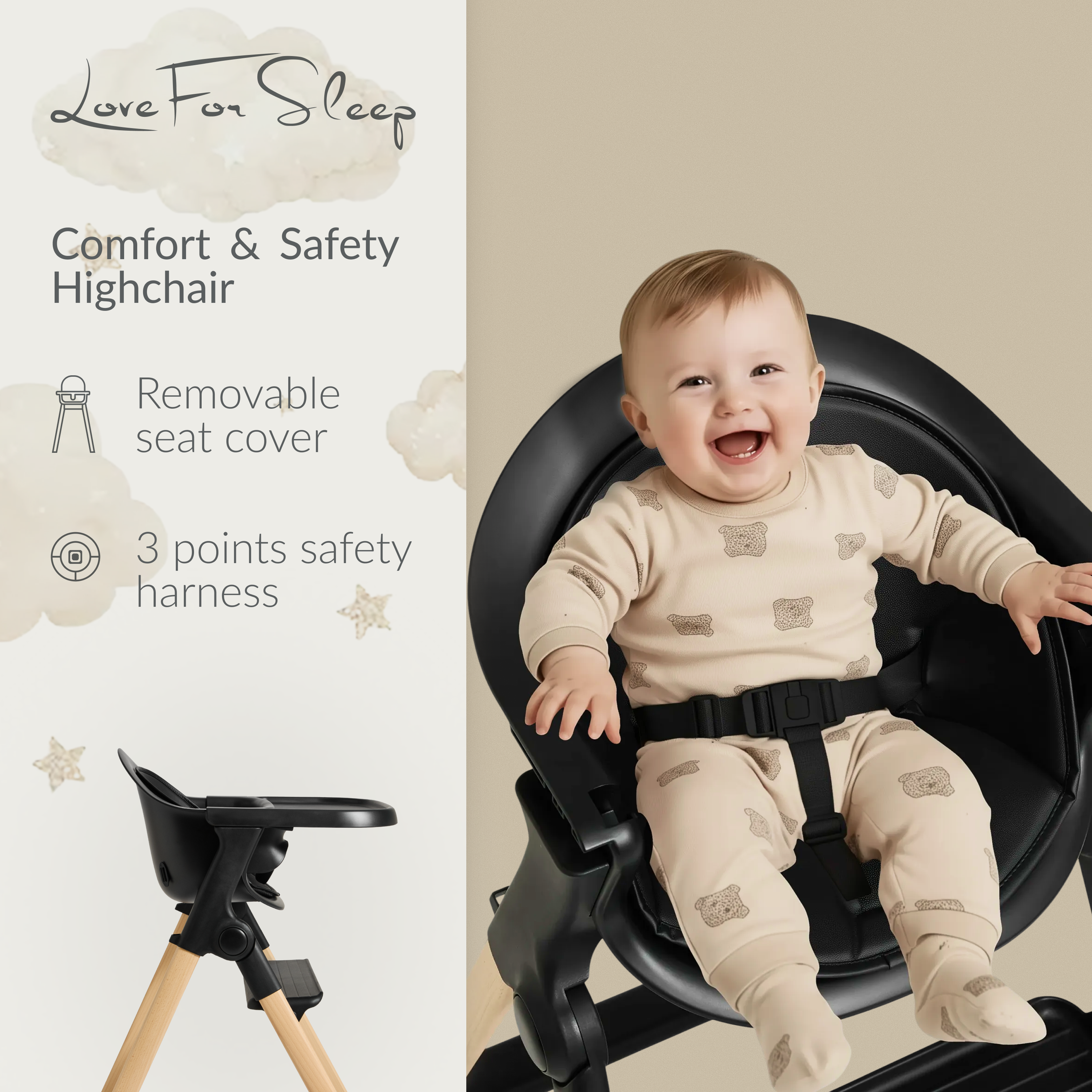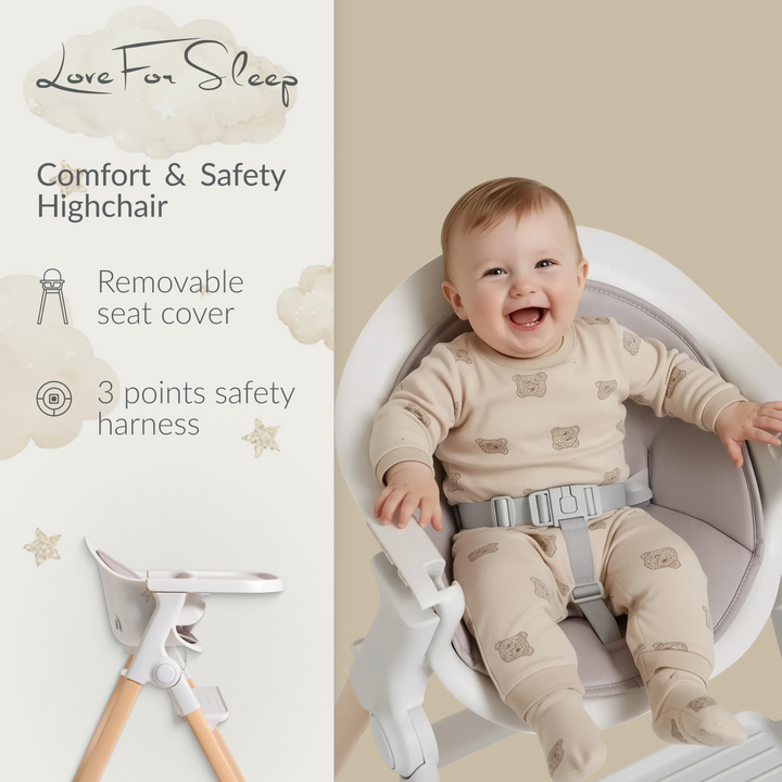 Built with safety at its core, the high chair features a secure 3-point safety harness and stable wooden legs, giving you confidence and peace of mind at every mealtime.