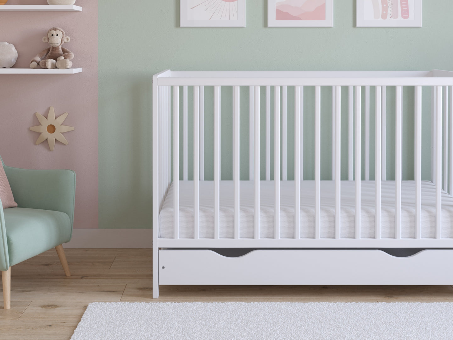 Experience the perfect combination of style and practicality with the Asher Cot Bed. This classic cot bed is designed to provide a safe and cosy sleeping environment for your little one. Featuring a spacious drawer which provides convenient storage for all your baby essentials.