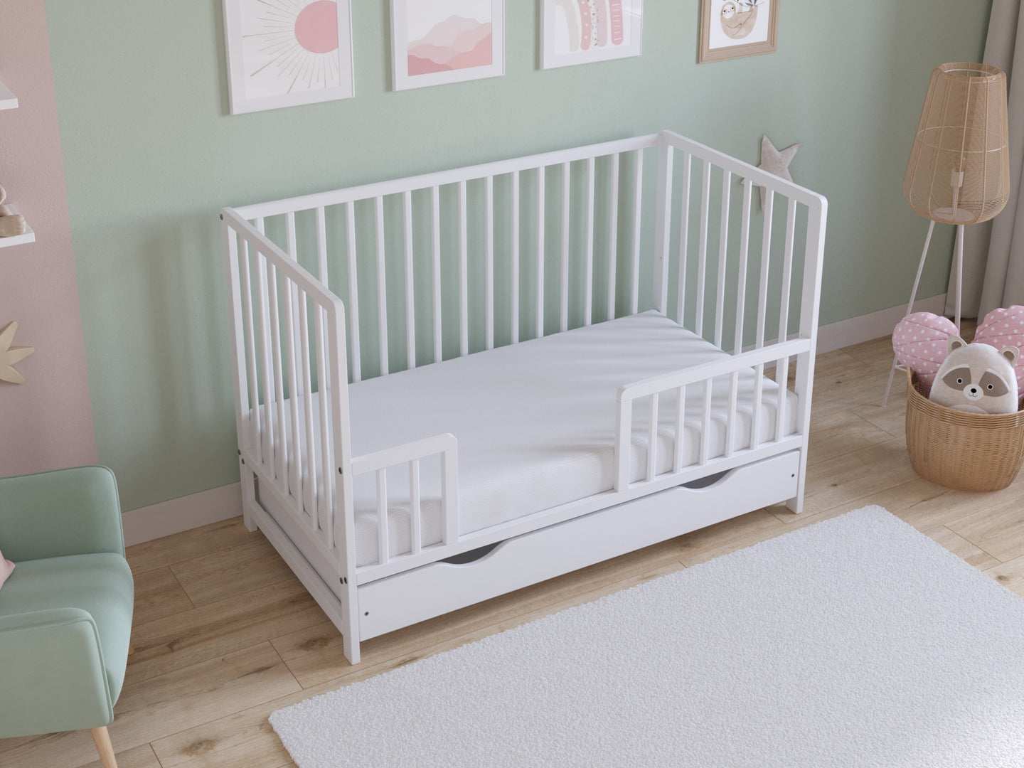 Additionally, with three adjustable cot mattress base heights, you can easily adapt the sleeping position as your child develops, providing optimal comfort throughout the night. It easily converts into a toddler bed by utilising the included bed guard, ensuring a smooth transition as your child grows.