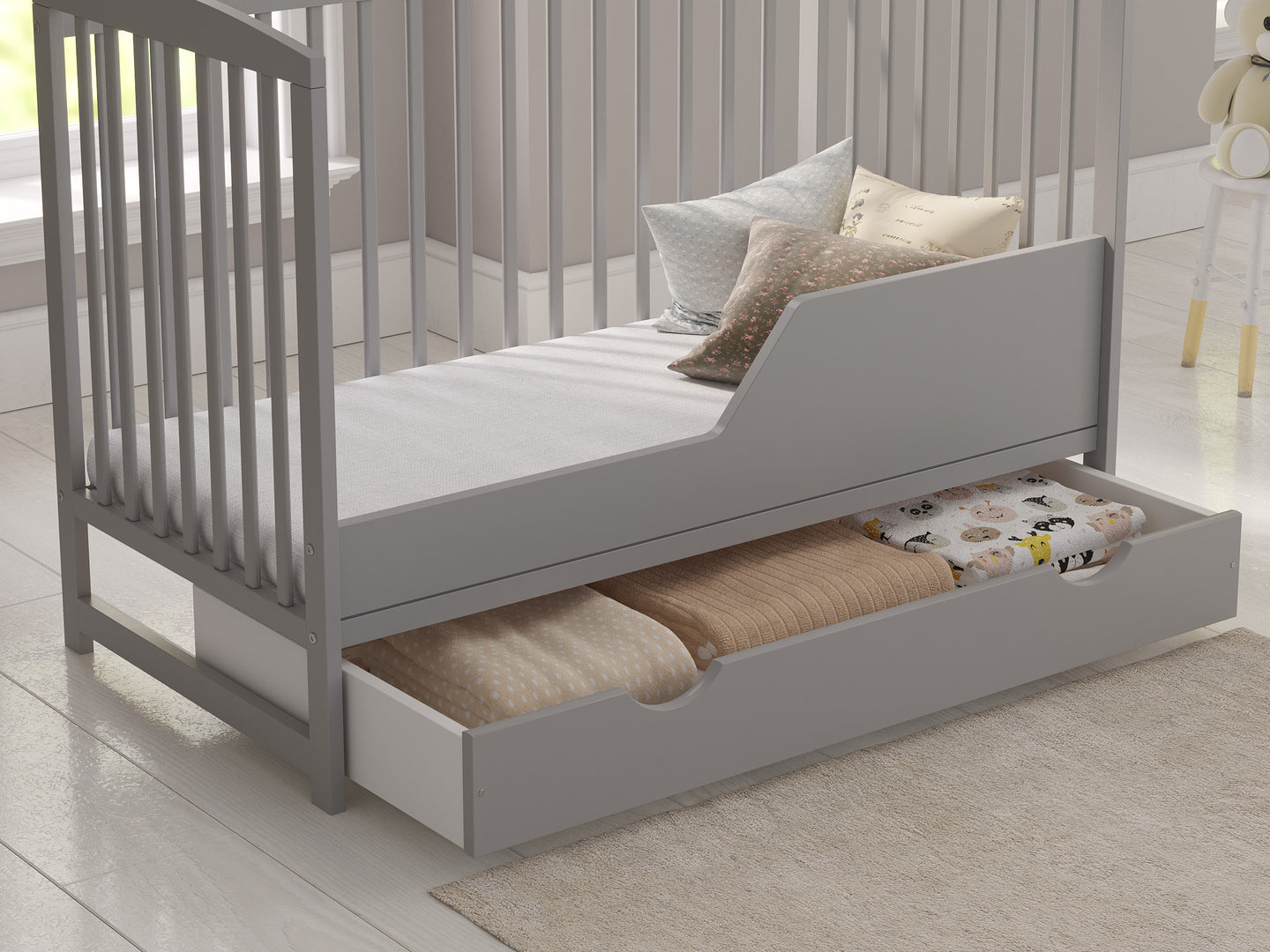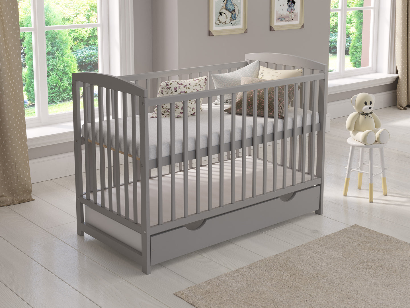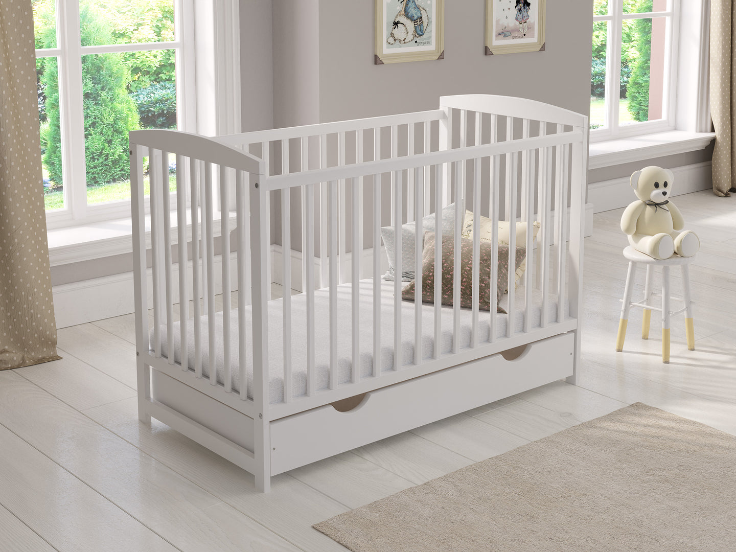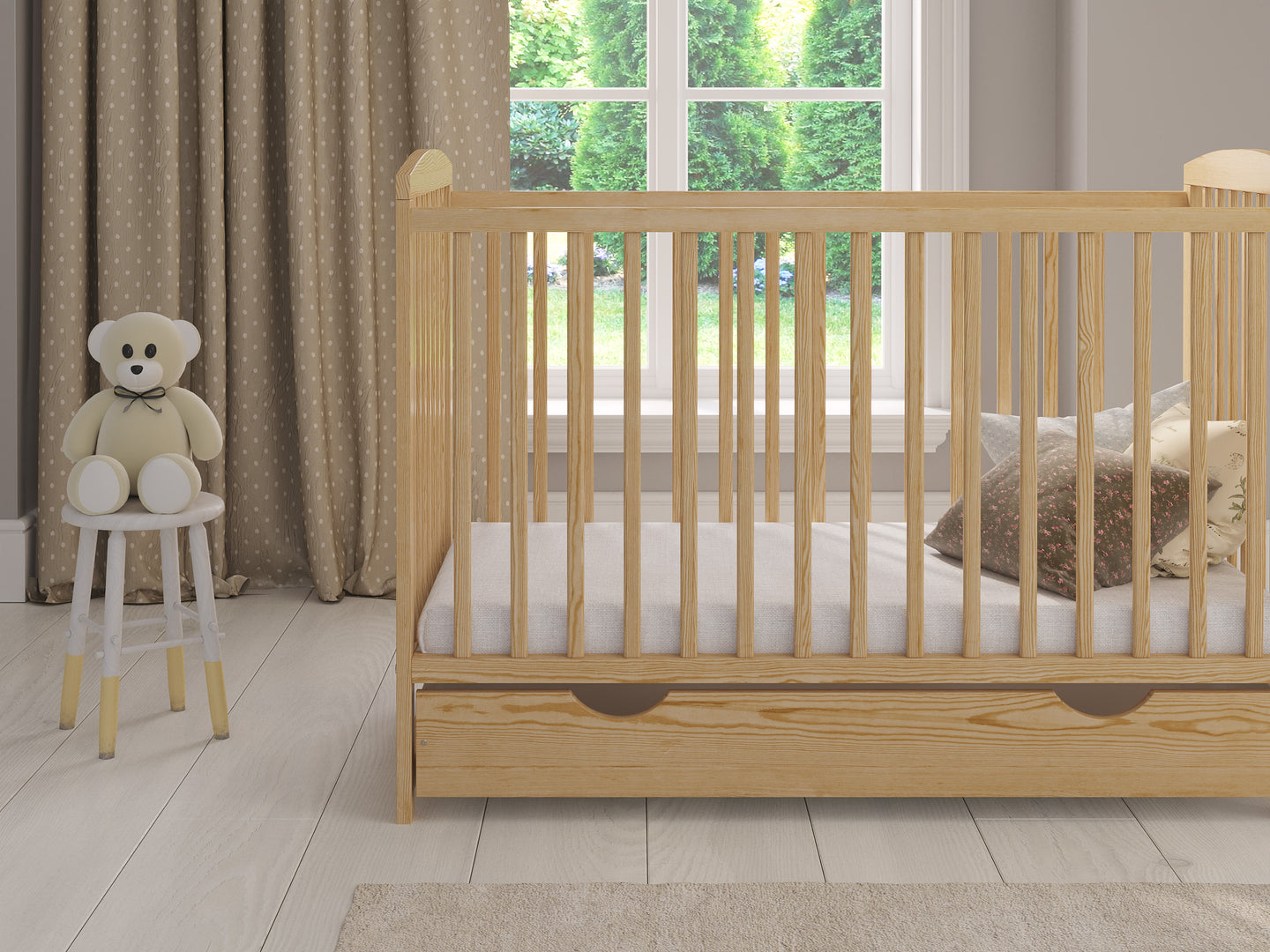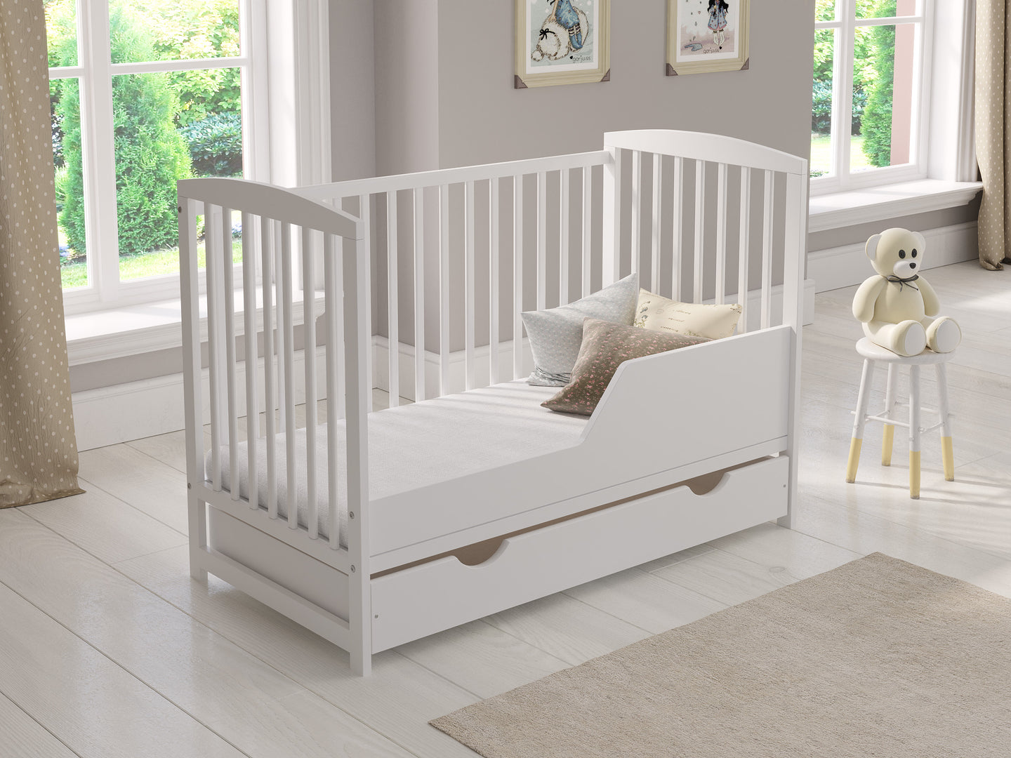 The three adjustable cot mattress base heights allow you to easily accommodate your growing child's sleeping preferences. The teething rails protect baby's delicate gums and prevent damage to the cot. Additionally, the spacious sliding drawer beneath the cot offers valuable storage for your baby's essentials.