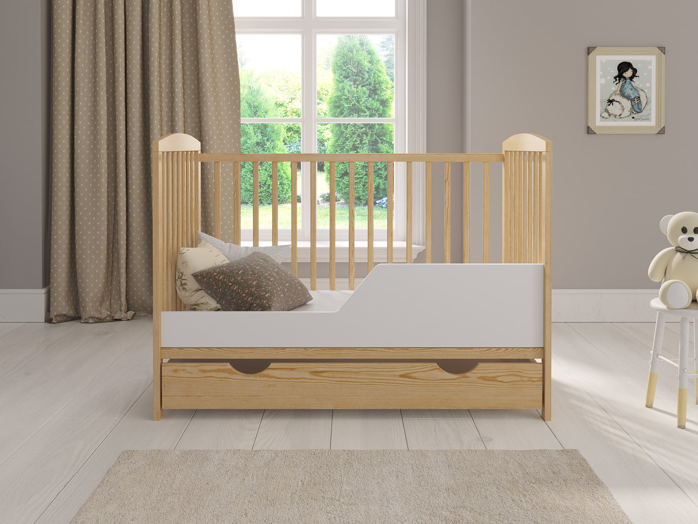 This exquisite cot bed is designed to meet all your baby's needs while adhering to the highest safety standards. With its spacious covered drawer, protective teething rails and additional wooden barrier, Jacob offers both functionality and comfort. It effortlessly transforms into a toddler bed with the included wooden barrier, ensuring a seamless transition for your little one.